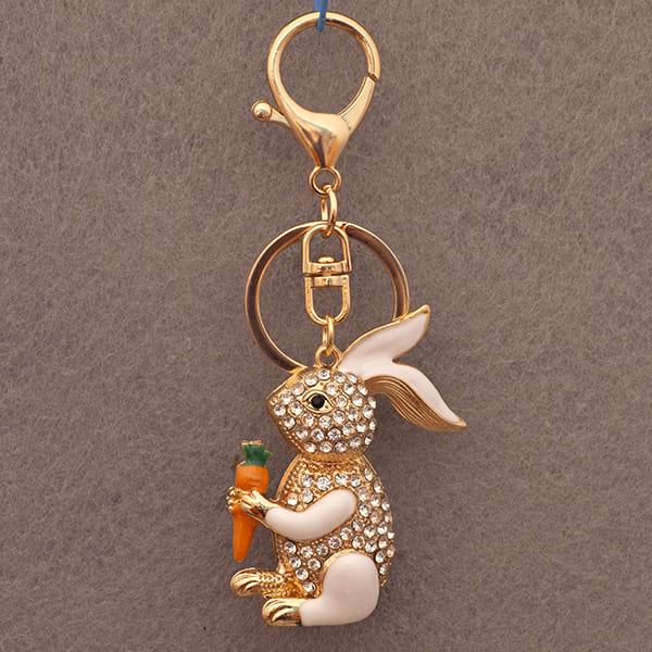 Сувенирный брелок для ключей. Подвеска сделана в форме зайчика с морковкой из металла золотого цвета, украшенного стразами. Заяц - символ 2023 года. Новый год 2023 по китайскому календарю - год Черного водяного кролика. Талисман с брелком кроликом принесет счастье и удачу в Новом году.