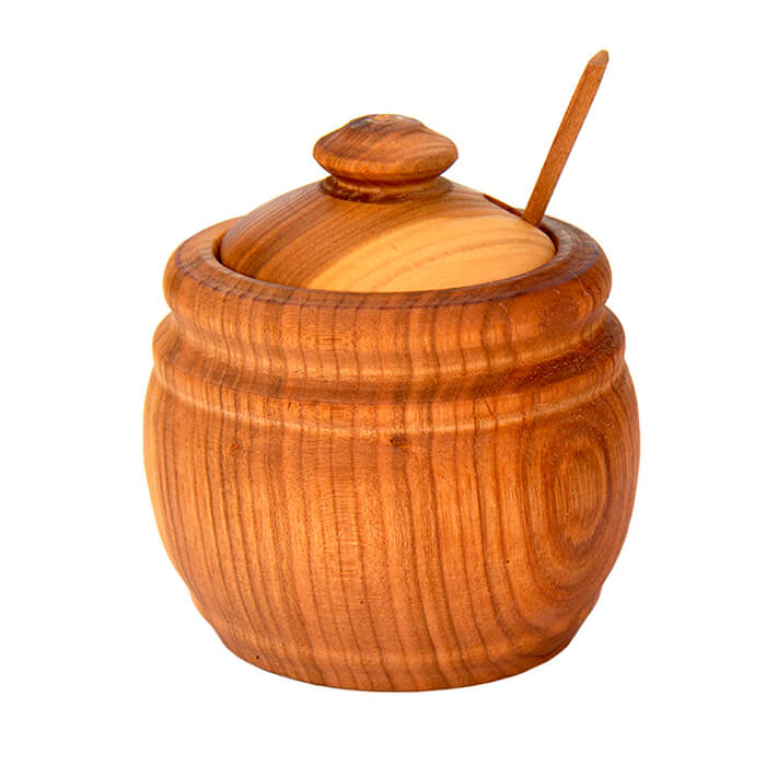 Баночка универсальная, почти без запаха. Дерево теплое, с плотными стенками. Черешня - теплое, пластичное дерево, устойчива к воздействию влаги, изделия из черешни великолепно сохраняют свойства продуктов.