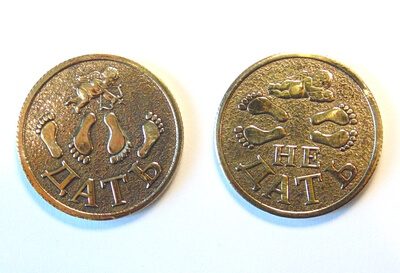 Металлическая монетка цвета старого золота. На лицевой стороне изображена надпись Дать, на другой - Не дать.
