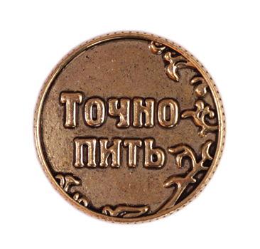 Металлическая монетка из металла цвета темного золота. На лицевой стороне изображена надпись “Пить”, на другой “Точно пить”.