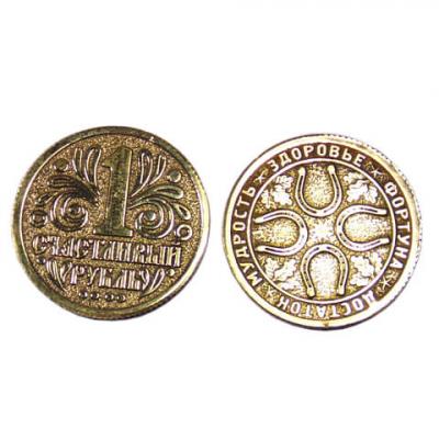 Металлическая монетка цвета старого золота. На лицевой стороне изображена цифра 1 и надпись “Счастливый рубль”, на обороте четыре подковы как символ удачи, надпись по кругу “Здоровье. Фортуна. Достаток. Мудрость”.