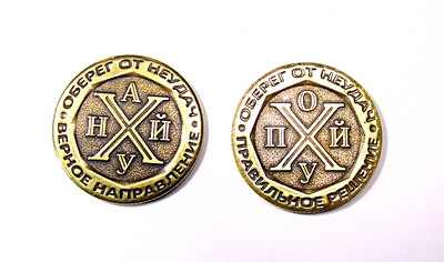 Металлическая монетка из металла цвета темного золота. На лицевой стороне изображена буква Х в обрамлении букв науй, на другой буква Х с буквами поуй.