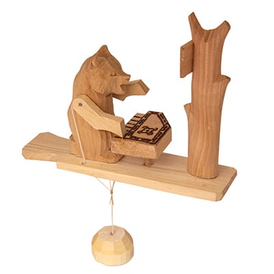 Оригинальная игрушка ручной работы. Каждый элемент вырезан вручную из массива липы. Поверхность без декора. Внизу груз, который при покачивании приводит в движении лапы медведя и кажется, что он играет на рояле.