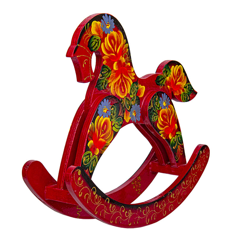 Красивая игрушка качалка сделана в форме лошадки. Основа из дерева, поверхность с лаковым покрытием, украшена художественной росписью, красный фон.