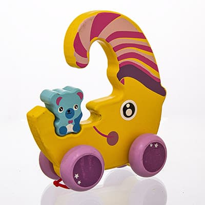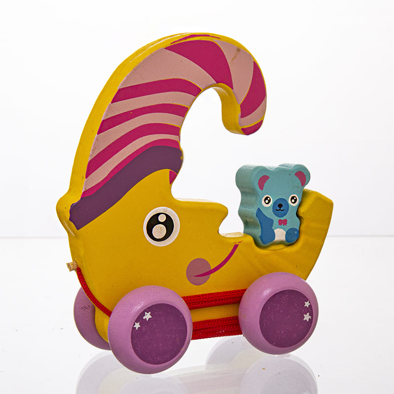 Каталка в форме полумесяца на котором сидит медвежонок. К каталке прилагается тесемочка длиной 80 см. Красивая безопасная игрушка.