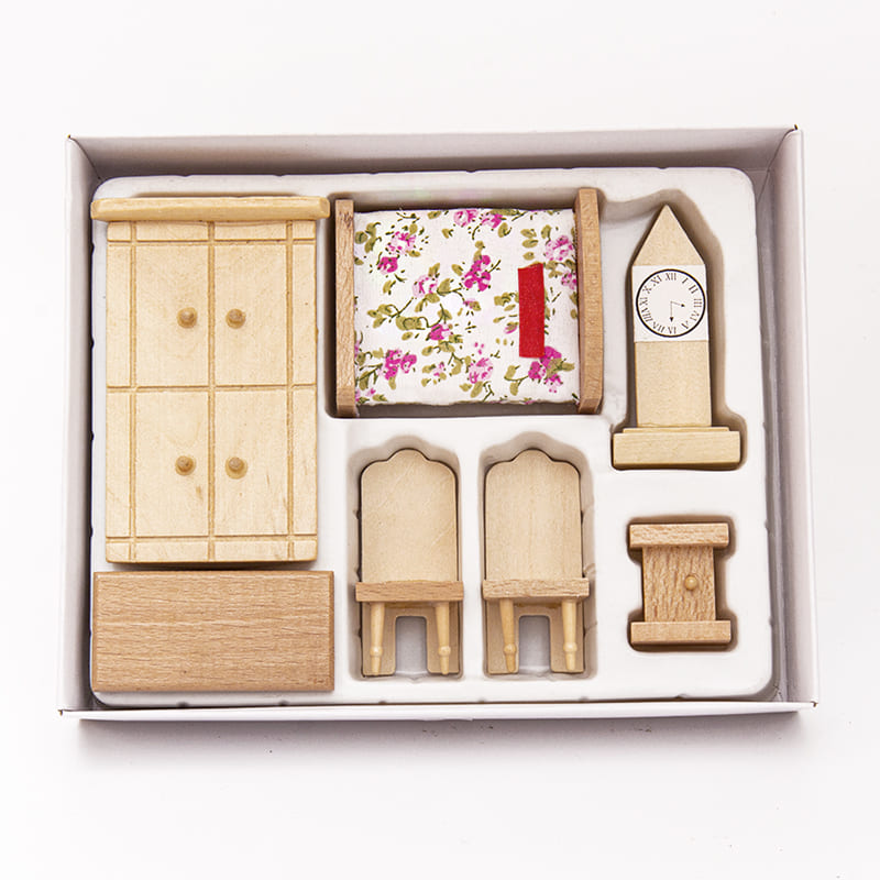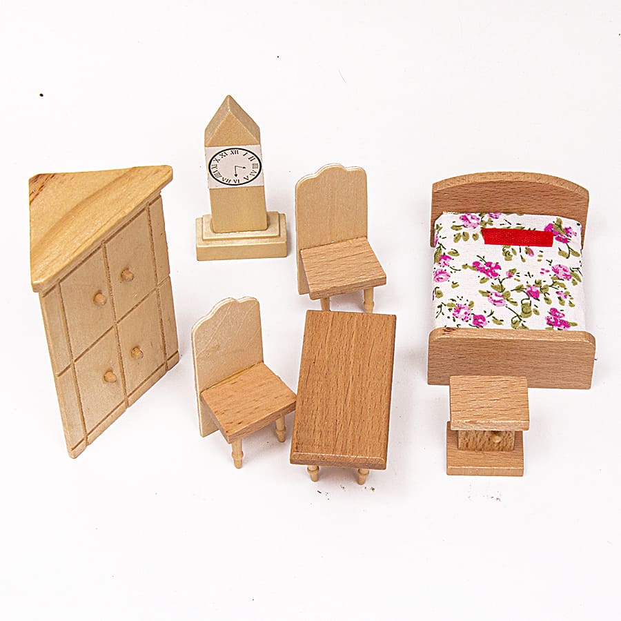 Набор мебели из дерева. В комплекте шкаф 9 х 5 см. Кроватка 7 х 5 х 2 см, часы 6,5 х 3 см, стол 6 х 3 см, 2 стула 6 х 2,5 см, тумбочка 3 х 2 см.