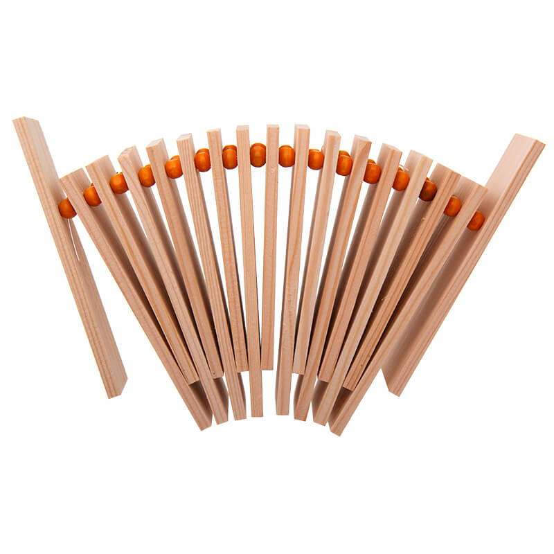 Деревянная трещотка, сделана по старинным технологиям. Форма гармошки, инструмент составлен из деревянных планок, поверхность гладкая, планки перемежаются с цветными бусинками.