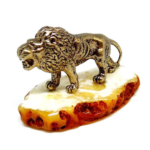 - миниатюрный лев из латуни на подставке из молочного янтаря