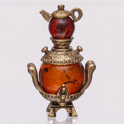 Фигурка - художественное литье. Сделана в форме маленького самовара с рельефным узором на поверхности, в центре самовара и чайника вставки из янтаря.