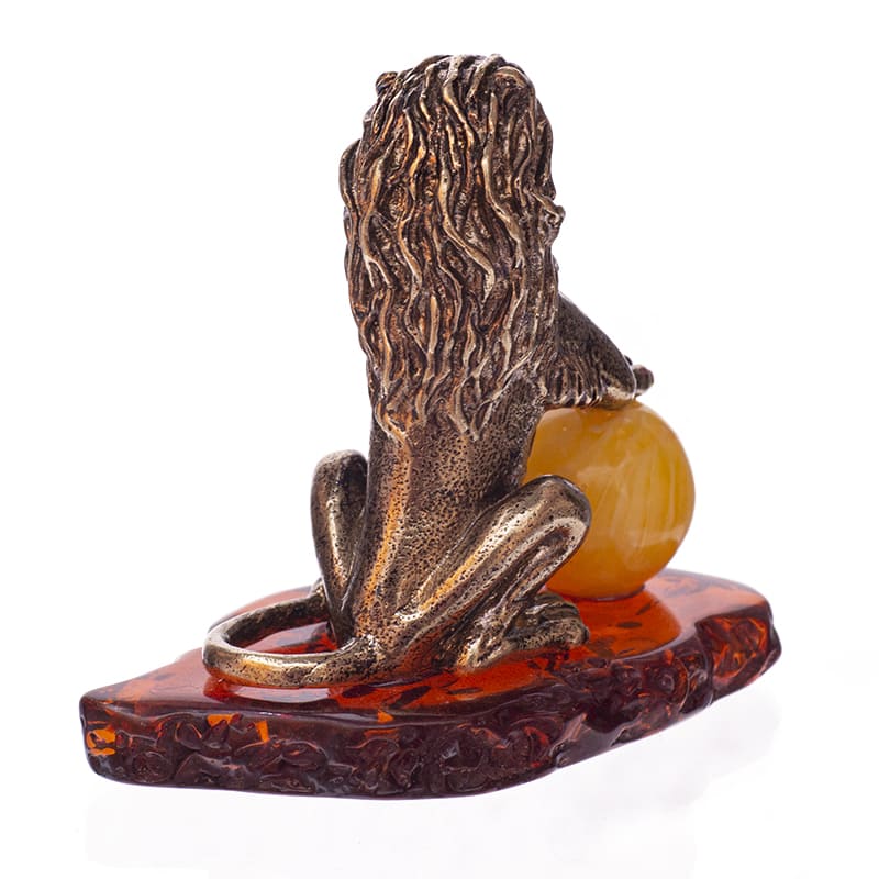 Фигурка - художественное литье. Сделана в форме льва с лапой на шаре из молочного янтаря.