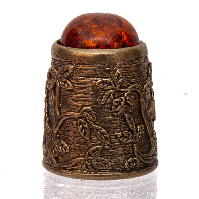 Наперсток отлит из латуни, в центре вставка из натурального янтаря. По краю рельефное изображение совы на ветке и растительный орнамент.