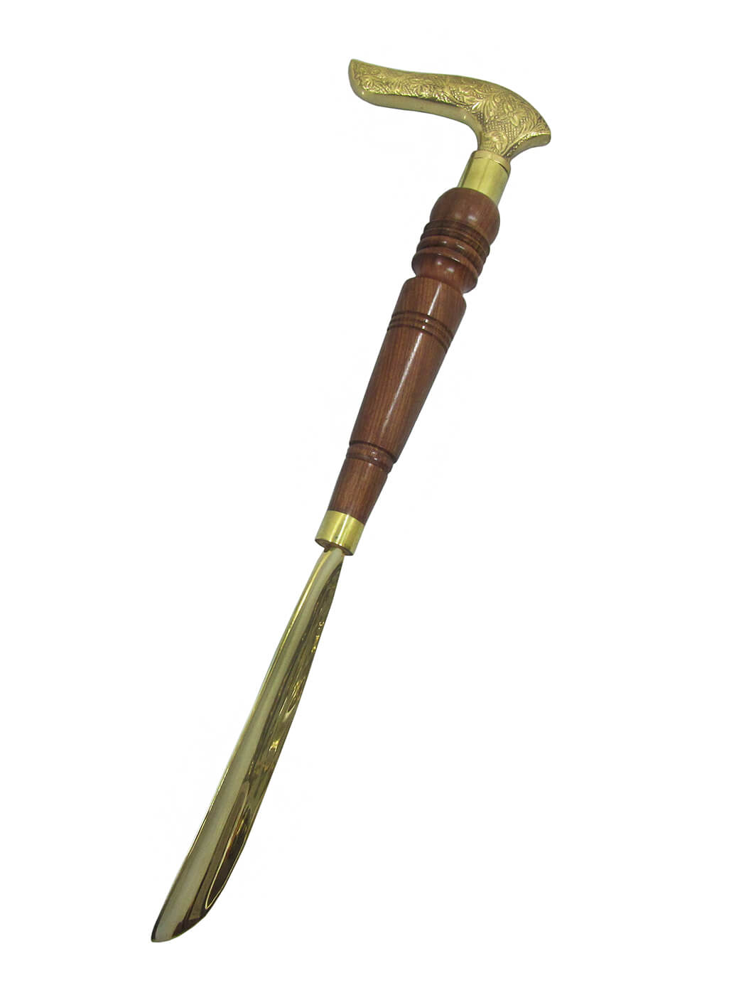 Рожок из латуни, с длинной ручкой. Верхняя часть ручки сделана в форме рычага с рельефным орнаментом.