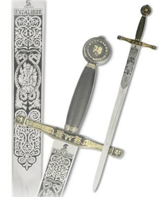 Массогабаритная копия меча по легенде принадлежавшего королю Артуру вождю бриттов V-VI века. Рукоять из специального сплава замак, клинок из не закаленной стали. На рукояти объемный кельтский орнамент.