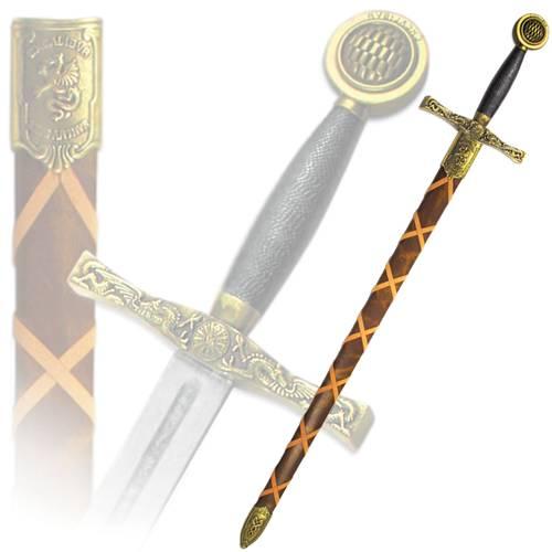 Массогабаритная копия меча по легенде принадлежавшего королю Артуру вождю бриттов V-VI века. Рукоять из специального сплава замак, клинок из не закаленной стали. На рукояти объемный кельтский орнамент.