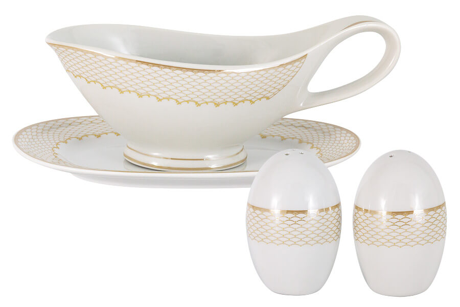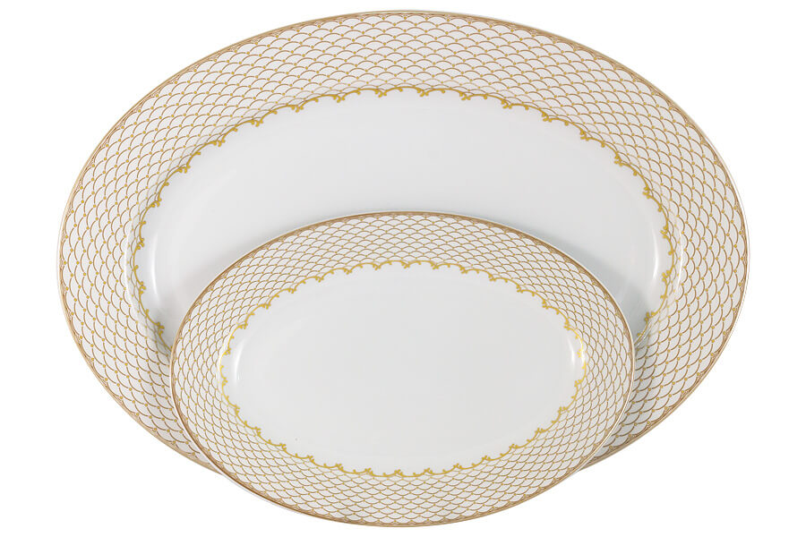 Обеденный сервиз из серии “Бельведер”. Коллекция “Бельведер” была вдохновлена венским дворцом Бельведер. О великолепном памятнике напоминают белоснежный фарфор и золотая сетка в стиле Барокко. Посуда “Бельведер” смотрится очень элегантно и дорого.