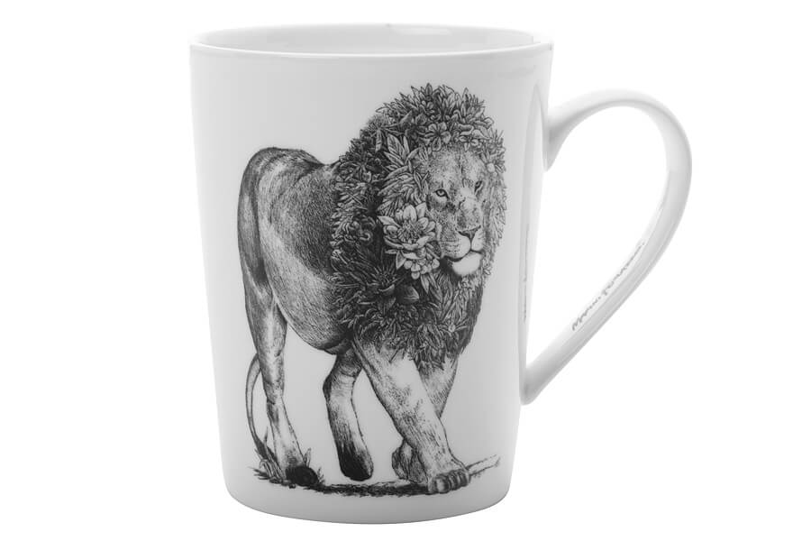 Красивая фарфоровая кружка с современным дизайном. Фон белый, в центре в монохромных тонах изображен идущий лев.