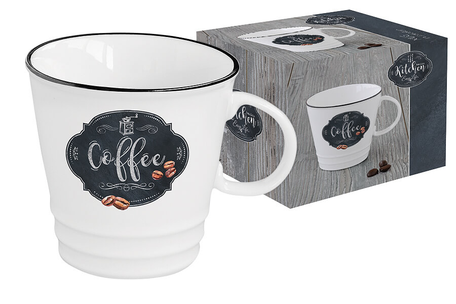 Основной фон белого цвета. Поверхность покрыта эмалью с матовым эффектом. Серия “Ретро” - это богатый выбор посуды с оригинальным дизайном. Линии очерчены черным кантом, кружка кажется эмалированной.