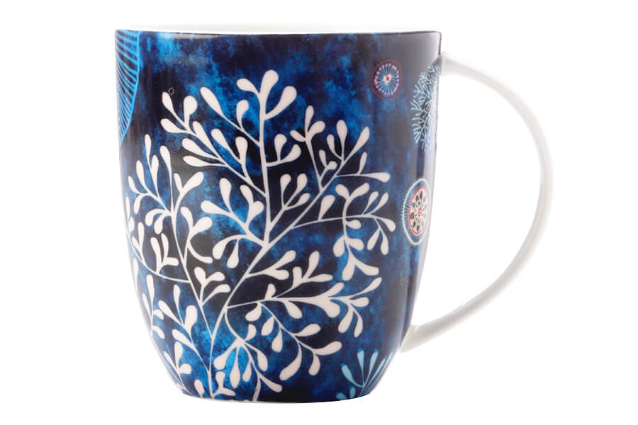 Красивая фарфоровая кружка с живописной поверхностью. На темном фоне изображены веточки, напоминающие рифы и водоросли.