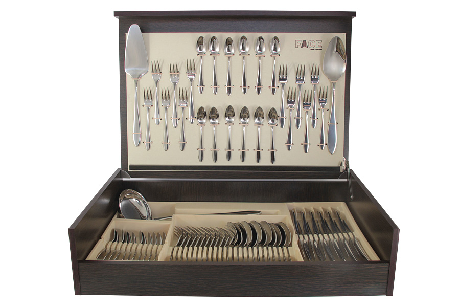 Набор изящных столовых приборов из нержавеющей стали. В наборе 12 столовых ложек, 12 чайных ложек, 12 кофейных ложек, 12 столовых вилок, 12 десертных вилок, 12 столовых ножей, половник, лопатка, ложка сервировочная.