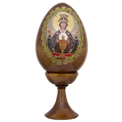 Пасхальное яйцо на ножке. На поверхности яйца печатное изображение иконы Неупиваемая чаша. Традиционный образ. Поверхность покрыта лаком.