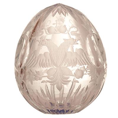 Оригинальное пасхальное яйцо из прозрачного хрустального стекла. На поверхности выгравированы двуглавые орлы, которые перемежаются с линзами. Ручная работа.