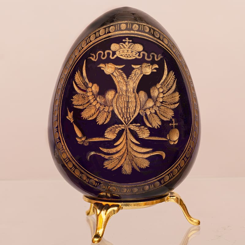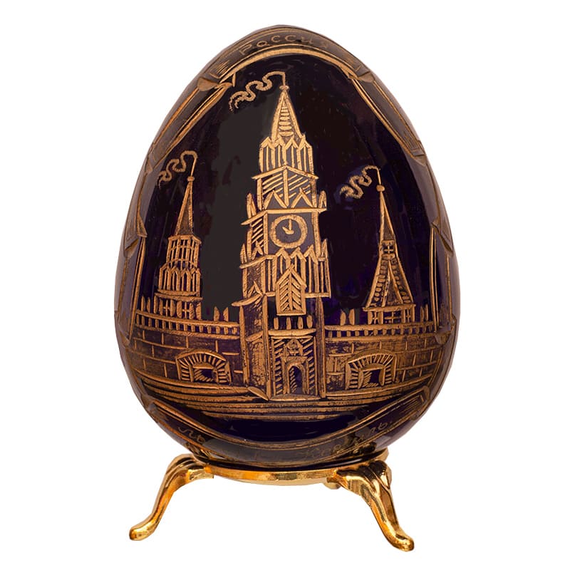 Пасхальное яйцо ручной работы, на поверхности изображение центра Москвы, на обратной стороне выгравирован двуглавый орел. Стекло плотное, темно-синего цвета. Прилагается подставка.