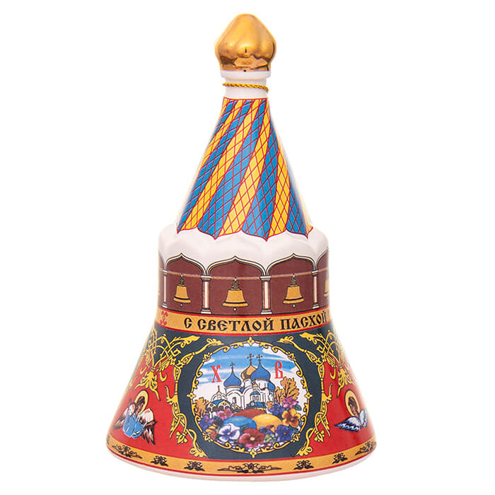 Сувенирный колокольчик из керамики. Верхушка ручка сделана в форме золотого купола. Внизу на колоколе изображены храмы, пасхальный кулич.