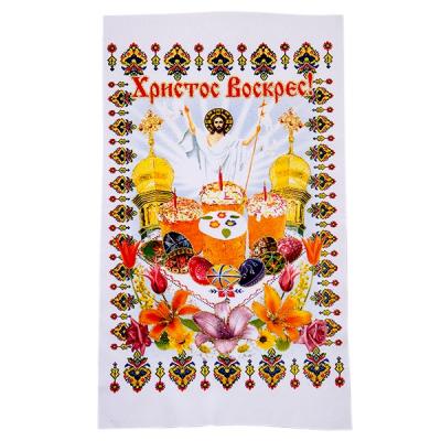 Красивый пасхальный рушник с печатным изображением. На рисунке золотые купола, Иисус Христос, лилии символизирующие Богоматерь. Узор и надпись украшены золотыми блестками.