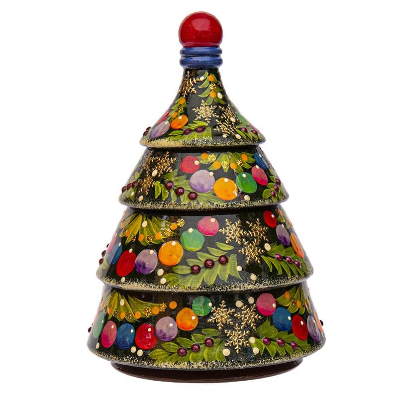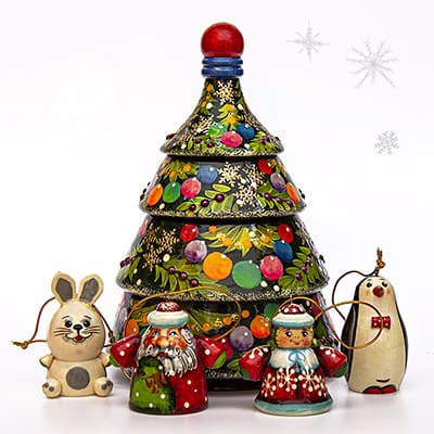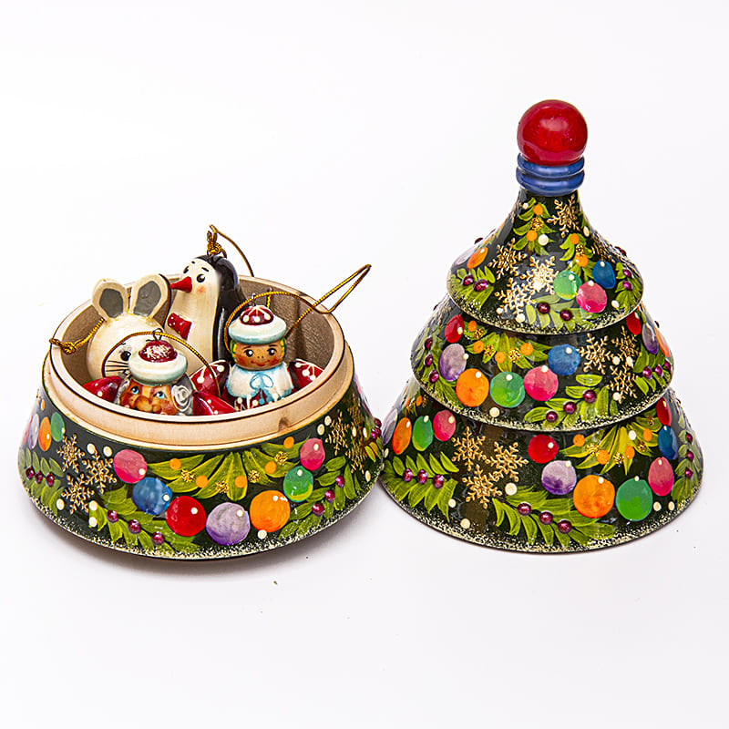 Идеальный вариант Новогодней елки с сюрпризом. Вариант матрешки - коробейник, когда внутри находятся игрушки. В комплекте 5 маленьких елочных игрушек из дерева, расписаны вручную.