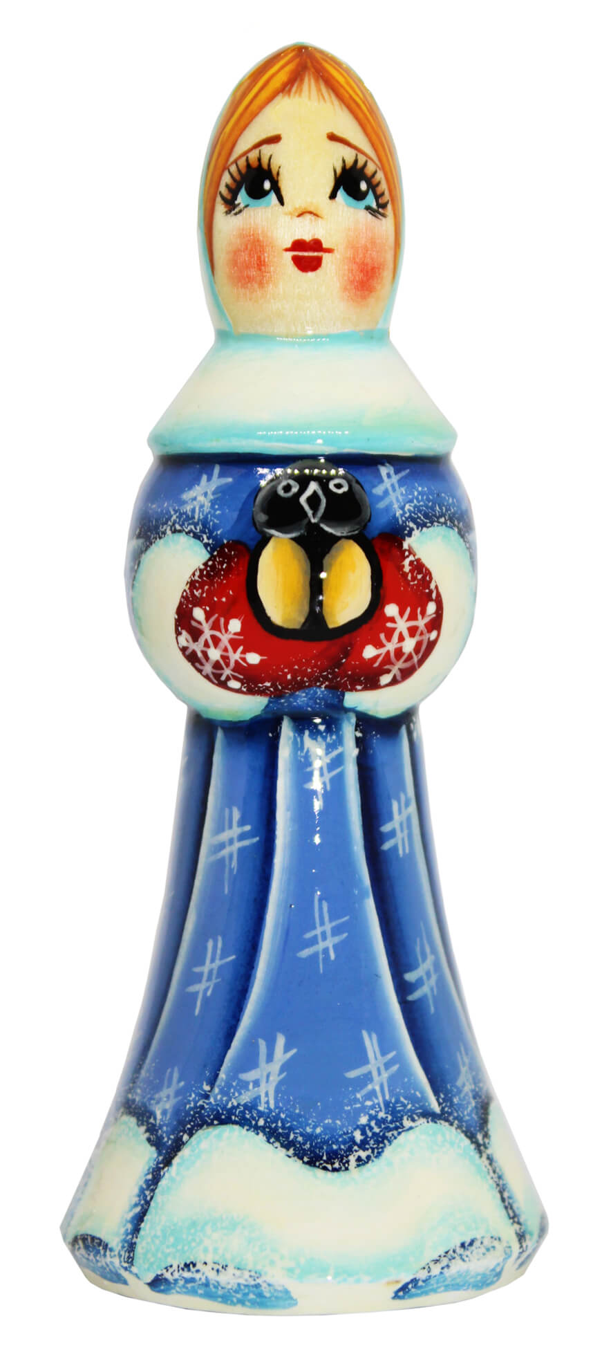 Маленькая фигурка Снегурочка. Одета в традиционный наряд - синяя шуба и платок на голове. В руках держит птичку, что подчеркивает близость Снегурочки к природе.