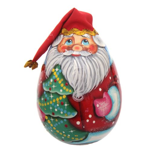 Неваляшка сделана в форме яйца, внутрь помещен колокольчик, который звенит при поворачивании Деда Мороза. Роспись выполнена профессионально и детально.