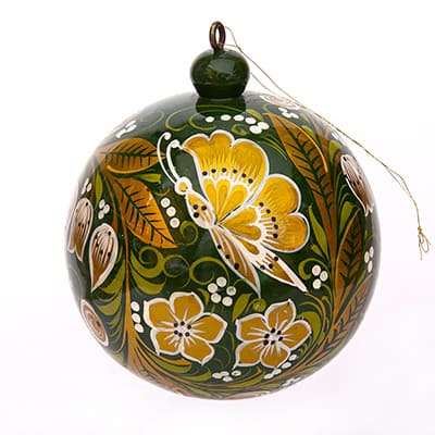 Новогодняя игрушка шар из дерева. Роспись выполнена профессиональным художником в традиционном хохломском стиле. Поверхность покрыта лаком.