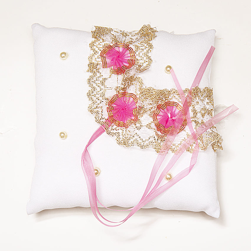 Атласная подушечка белого цвета, украшена розовыми атласными лентами и золотым кружевом. Нежное сочетание белого и розового цветов.