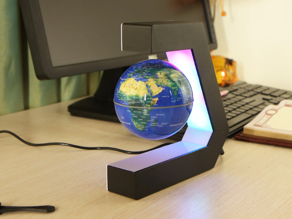 Устанавливается только на гладкой, ровной поверхности, иначе не будет работать. Подключается к электросети. При включении, глобус парит сам по себе, удивительное зрелище. Глобус может вращаться по часовой стенке или против, в зависимости от направления вращения.