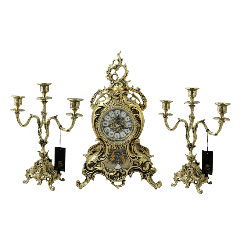В наборе каминные часы с корпусом из бронзы с рельефным узором в стиле барокко. Циферблат с римскими цифрами, работает от батареек. Два трехрожковых канделябра. Сделаны из бронзы, металл блестящий.
