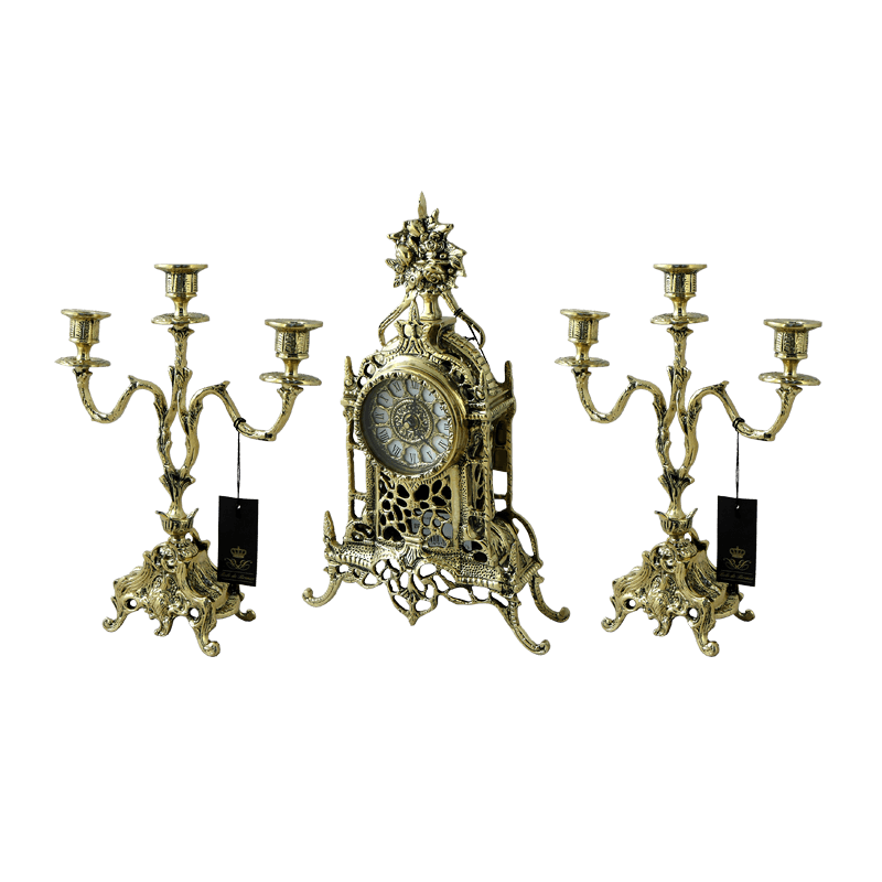 В наборе каминные часы с корпусом из бронзы с рельефным узором в стиле барокко, вверху букет из роз. Циферблат с римскими цифрами, работает от батареек. Два подсвечника на три свечи. Сделаны из бронзы, металл блестящий.