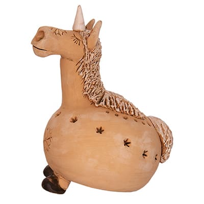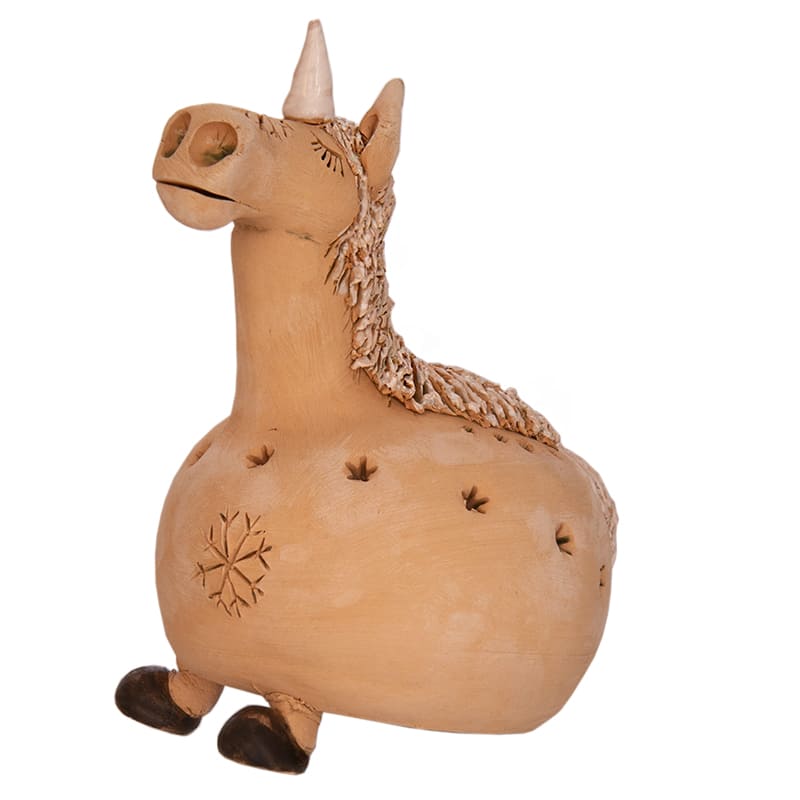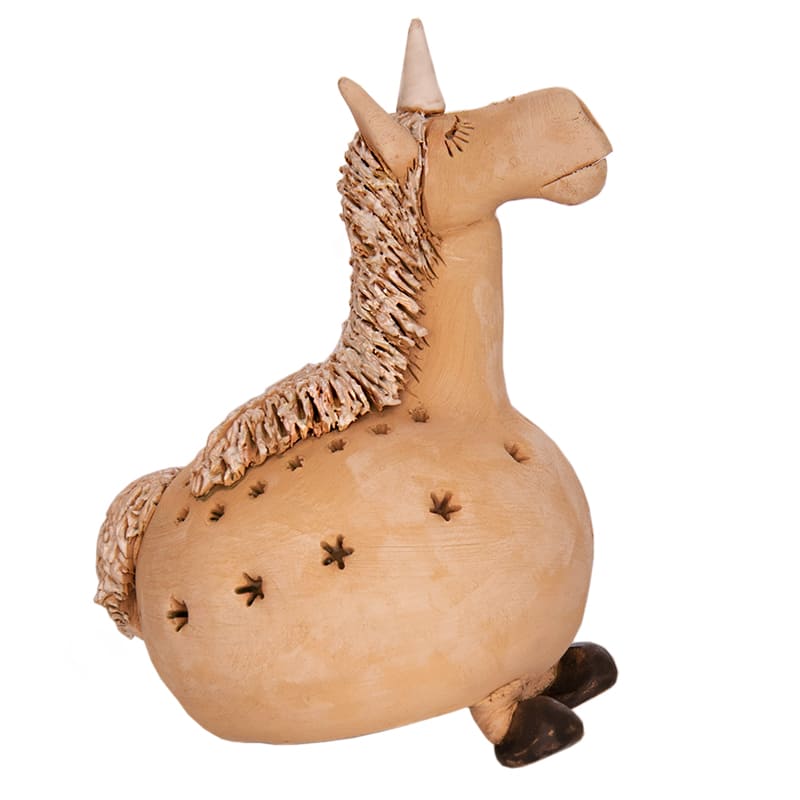 Красивый единорог. Поверхность покрыта глазурью песочного цвета, дополнена орнаментом. Очаровательный конь - станет вашей любимицей. Внутри единорог полый - можно поставить чайную свечу и использовать статуэтку как подсвечник.