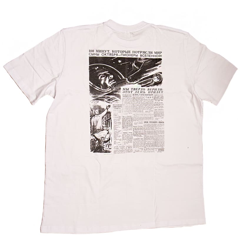 На поверхности принт стилизованный под газетные статьи из “Известий” - первый человек в космосе и другие события советского прошлого.