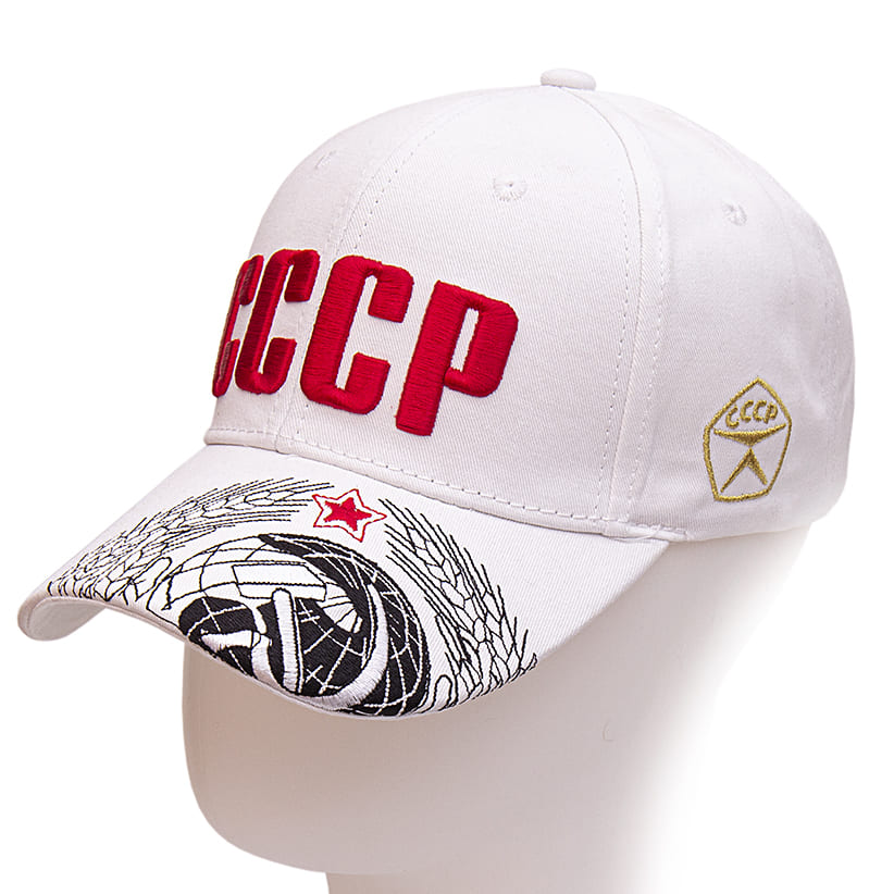Стильная, современная бейсболка, сшита из хлопка белого цвета. Верхняя часть украшена вышитыми буквами СССР, на козырьке вышит фрагмент герба СССР. По бокам советская символика - знак качества и серп и молот.
