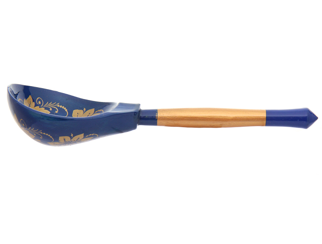 Ложка синяя кудрина. Этот вид росписи называется кудриной, так как черпачок покрывают золотые, изящные кудри написанные тонкой кисточкой. Так как роспись выполняется вручную, узор может быть разным - цветочки, лепестки, птички. Фон на черпачке и кончике ручки - темно-синий, насыщенный, великолепно сочетается с тонким золотым узором. На Руси синий цвет ассоциировался с безоблачным небом и мужским началом, поэтому синий считается издавна цветом мужчин. В некоторых областях России на свадьбу невесте дарили красную ложку, а жениху - синюю.
