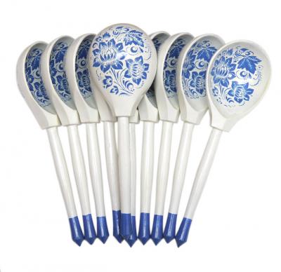 Каждая ложка расписана вручную. Тонкий голубой узор бесподобно смотрится на белом фоне. В комплекте 10 штук, это оригинальный и незабываемый подарок, в котором органично соединились два известных русских промысла - Гжель и Хохлома. Ложки сделаны хохломскими мастерами, за основу взят стиль Гжель. Набор понравится тем, кто любит народное творчество, коллекционирует Гжельскую или хохломскую посуду.