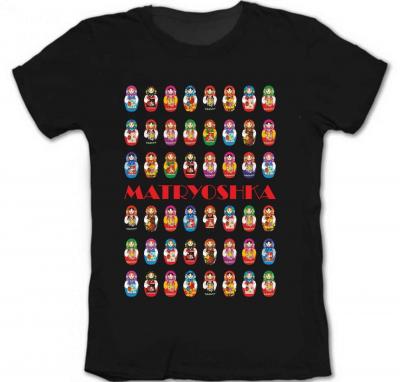 Футболка из хлопка высокого качества. Стильный дизайн и модель. В наличии размеры L и XXL. Поверхность украшена изображением разных матрешек и надпись на английском языке.