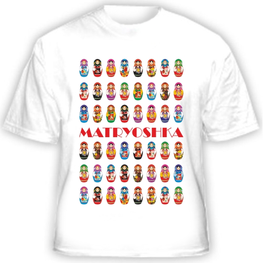 Футболка из хлопка высокого качества. Стильный дизайн и модель. В наличии размеры L и XXL. Поверхность украшена изображением разных матрешек и надпись на английском языке.