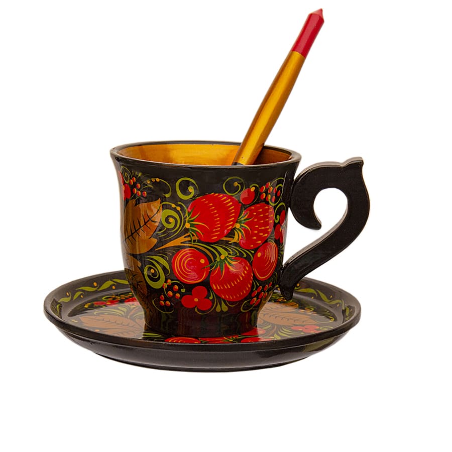 Авторский набор для сервировки стола. Каждый предмет сделан из дерева. Роспись традиционная хохломская - черный фон и яркий ягодный орнамент. Поверхность покрыта пищевым лаком. Комплект универсальный, в нем можно подавать кофе или чай.