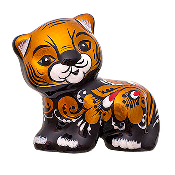 Оригинальная работа хохломских художников. Фигурка тигренка сделана из керамики, внутри полая. Поверхность расписана в традиционной хохломской технике с эффектом золочения. Керамическая поверхность сначала была покрыта металлическим порошком, прошел этап обжига. Затем, фигурка передается профессиональному художнику который украшает ее традиционным узором. Основа — черный фон, дополнен ягодами или золотыми цветами.