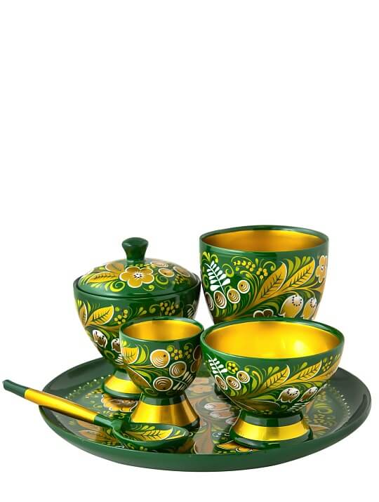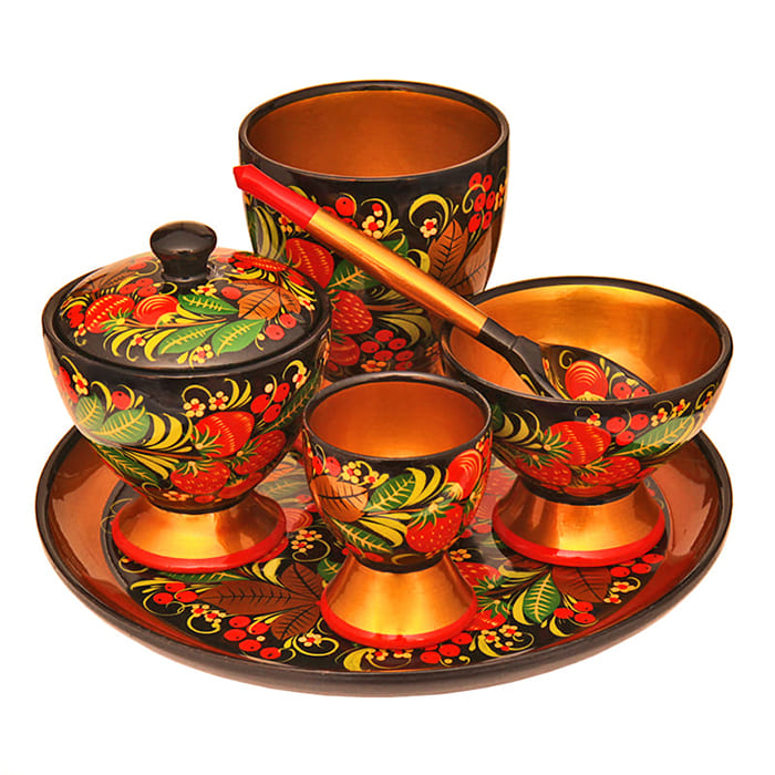 Хохломской набор состоит из универсальных предметов посуды. В комплекте круглый поднос, который можно использовать как тарелочку или блюдце. Маленькая рюмка, подходит в качестве подставки для яйца. Вазочка на ножке с маленькой ложкой, бокальчик, емкость с крышкой. Каждый предмет изготовлен из дерева, роспись выполнена профессиональным художником. Поверхность покрыта специальным безопасным лаком, который не взаимодействует с продуктами, без запаха и посторонних вкусовых воздействий.