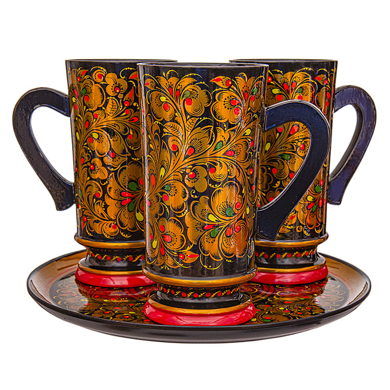Основной фон черный, узор цветочный. Традиционный хохломской стиль. Каждый предмет выточен из массива березы.