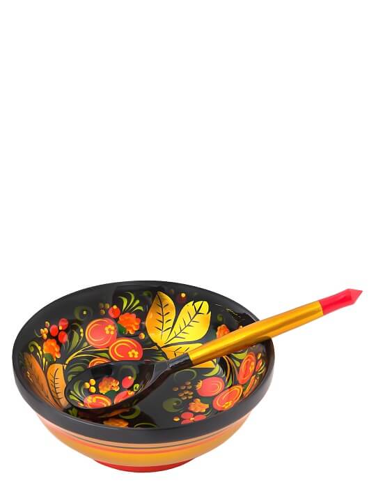 Характерная черта хохломских наборов - каждым предметом можно пользоваться отдельно. Мисочка подойдет для сервировки посуды и блюд. Ложку использовать как чайную или десертную. Жидкости и продукты в мисочке можно хранить до 48 часов.