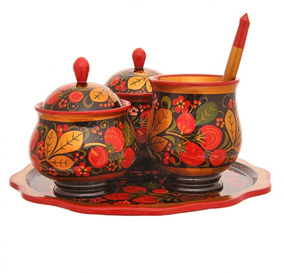 Универсальное использование. Столовый набор с хохломской росписью можно применять для подачи специй, десертов, закусок. Баночки универсальные, практичные. Можно сервировать стол в русском стиле.