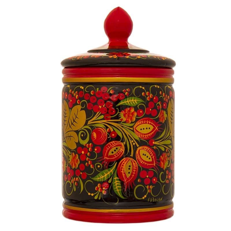 Универсальное применение, используется как банка, емкость, поставок. Раньше в поставках хранили различные сыпучие продукты и специи. На обороте клеймо фабрики АО “Хохломская роспись”. Полностью ручная работа.